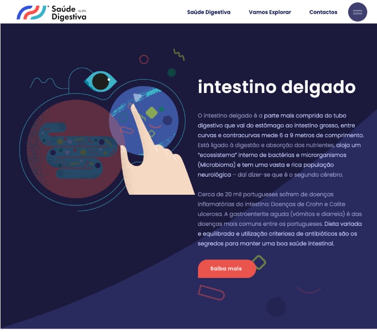 A saúde digestiva teve a nossa colaboração inicial no desenho e estrutura do site, sendo que a base inicial foi as ilustrações para os vários orgãos do sistema digestivo e posteriormente a sua animação (motion design) no web site.